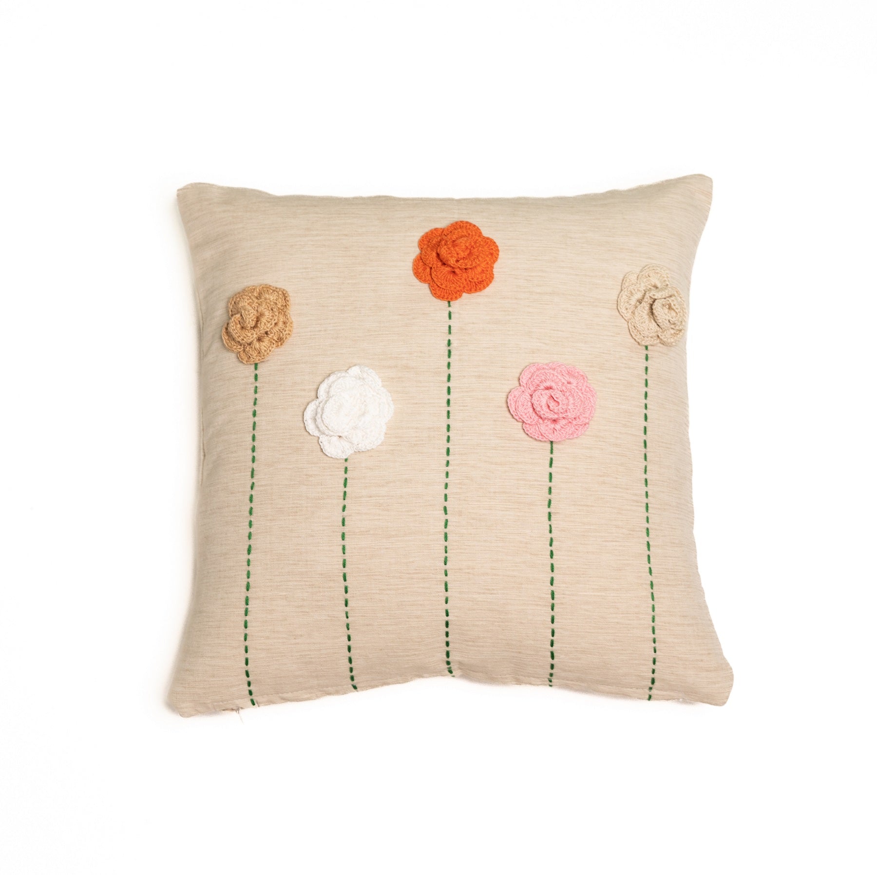 | Fabric - Handwoven cotton (medium weight) Cushion size - 16x16 inches Sold per piece Inseam zipper opening Does not include filler The cushion covers have been adorned with hand crocheted rose flower appliques. The stems have been hand embroidered using kantha stitch. We use only anchor threads for crochet and embroidery and they are color fast. WASH & CARE: The subtle imperfections in the weave, texture and colors are a natural outcome of handcrafted textiles and not a defect. * Hand wash separately in cold water. * Machine wash on gentle cycle * Hang dry in shade * Low heat iron * Don't use bleach |