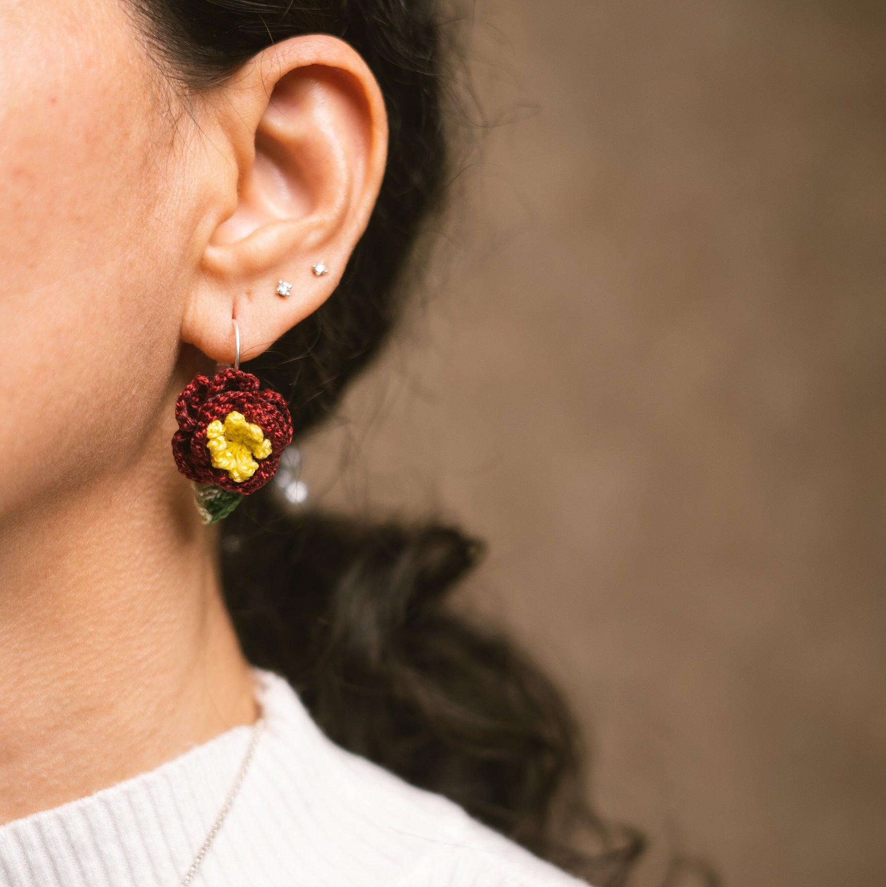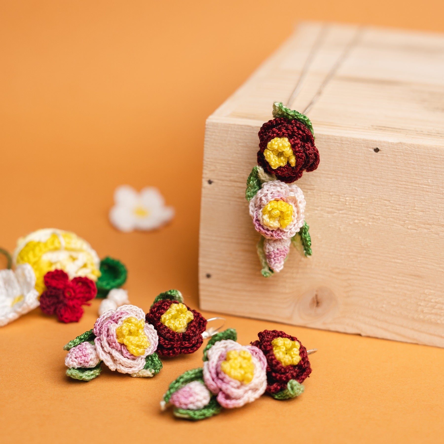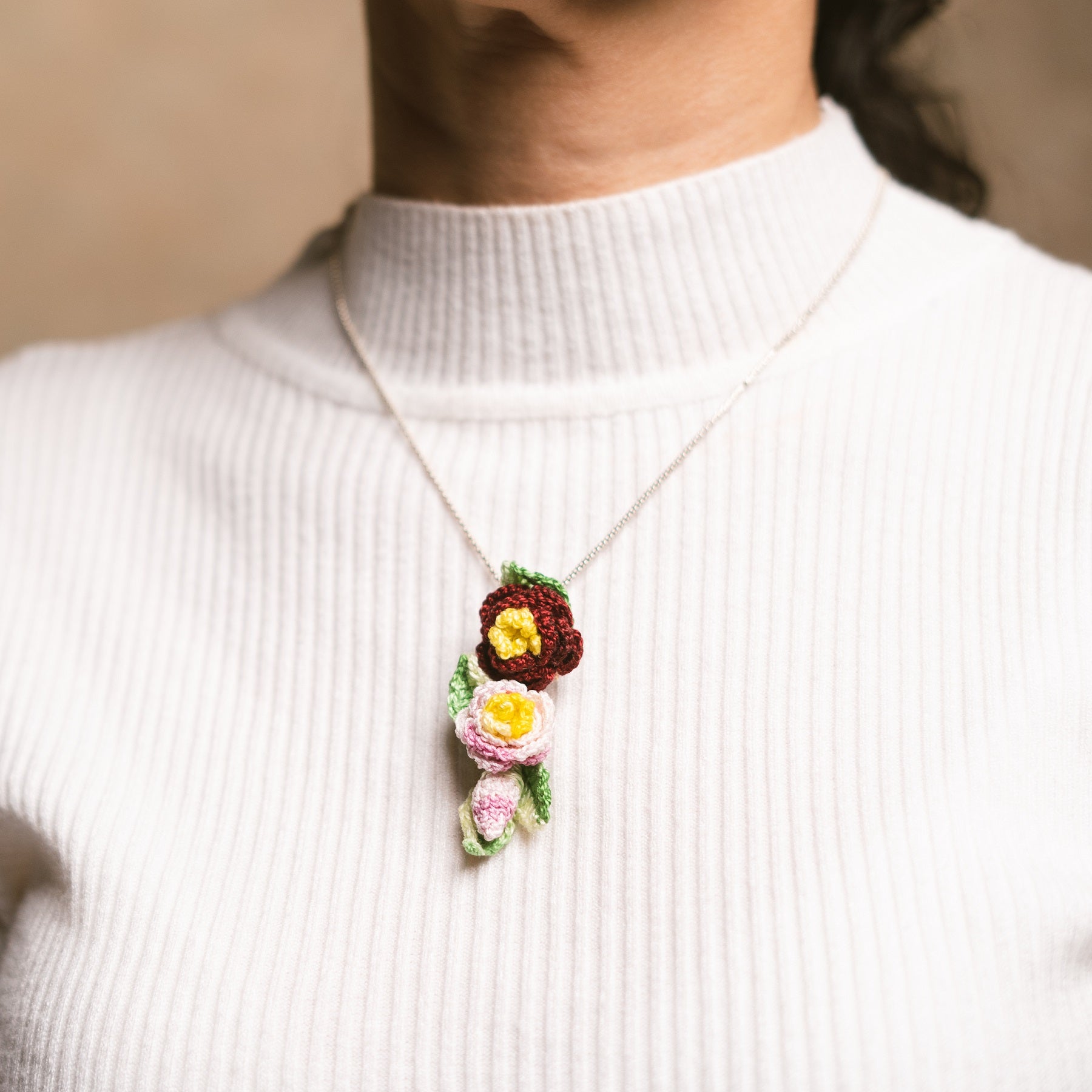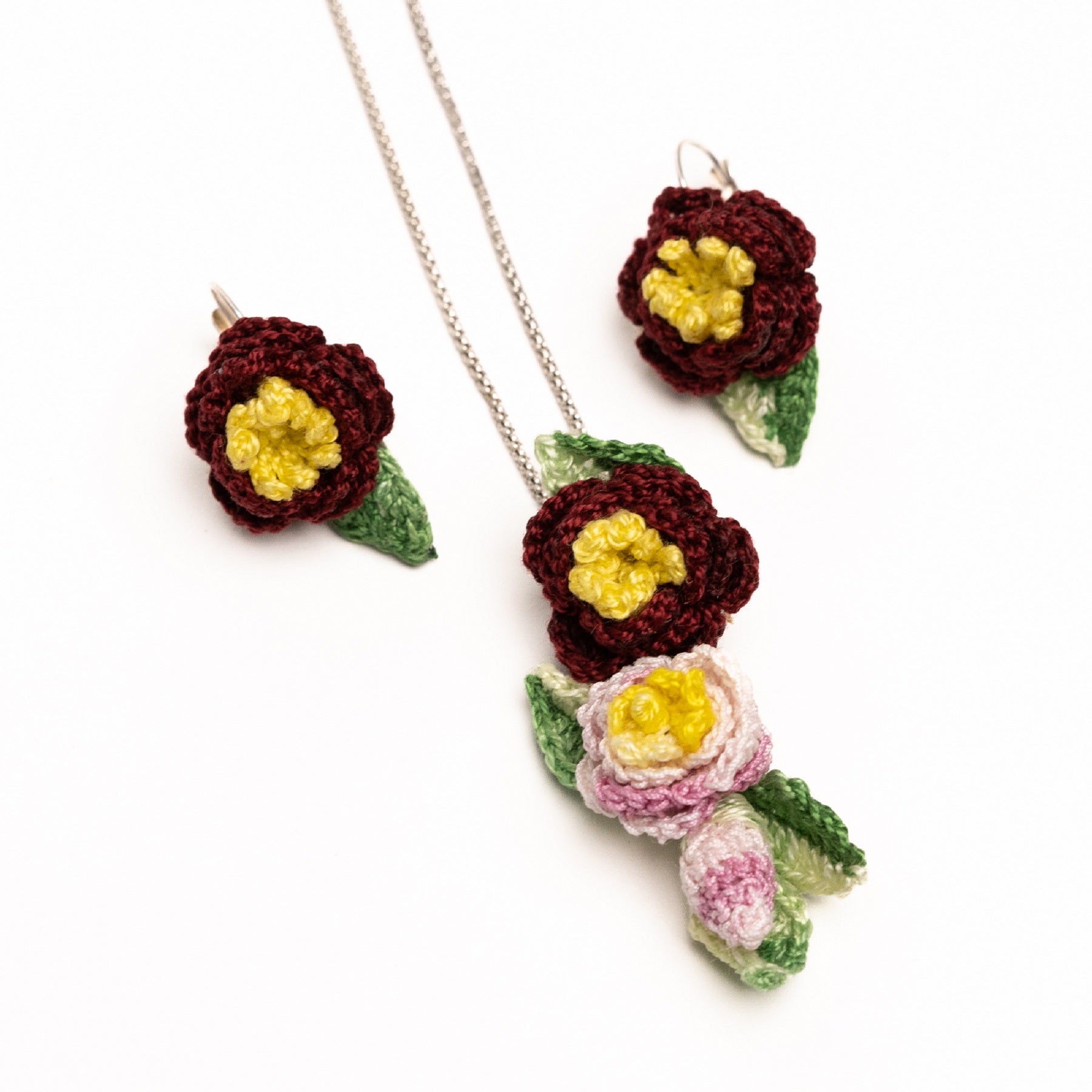 | Make a statement with the micro crocheted set of pendant and earrings. It is a handmade product and slight irregularities are a part of the human touch. The chain in the picture is not included in the product. |